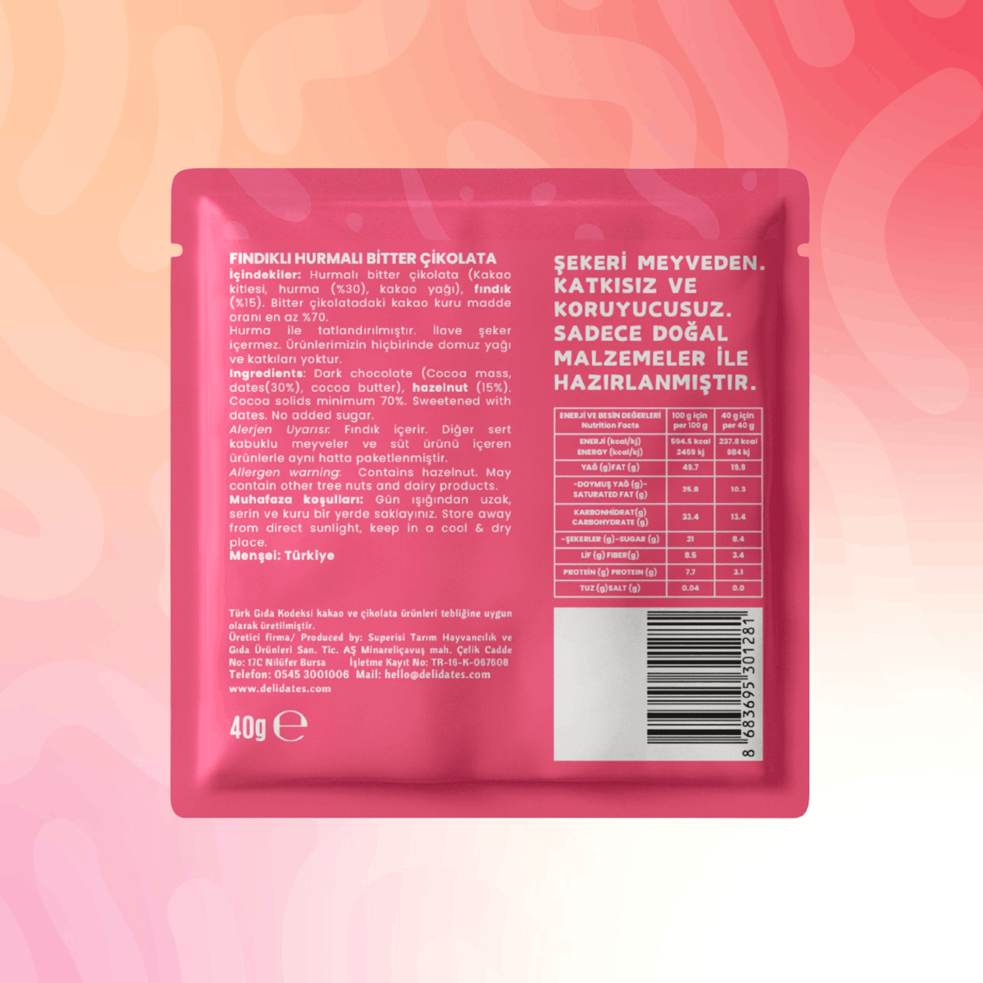 Delidates Fındıklı Hurmalı Bitter Çikolata 40 gr